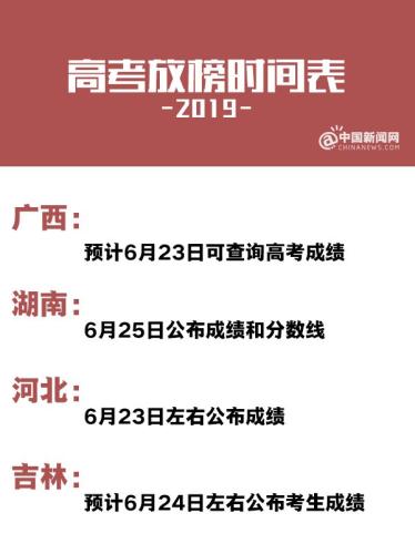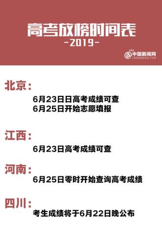 其中,四川計(jì)劃於6月22日晚公布成績(jī)﹔北京、湖北、江西、安徽、廣西、河北定於6月23日﹔新疆、吉林定於6月24日﹔山東定於6月25日前﹔河南、湖南、廣東等地的考生則可於6月25日起對(duì)成績(jī)進(jìn)行查詢(xún)。