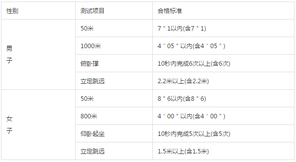 第九條 以上專業(yè)均進行體能測試,成績合格標(biāo)準(zhǔn)(所稱以上、以內(nèi)均包括本數(shù))見下表: