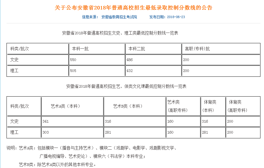 人民網(wǎng)北京6月23日電 今天,安徽省考試院公布安徽省2018年普通高等學(xué)校招生錄取最低控制分?jǐn)?shù)線,本科一批錄取控制分?jǐn)?shù)線:文科550分,理科505分;本科二批錄取控制分?jǐn)?shù)線:文科486分,理科432分。(劉婧婷)