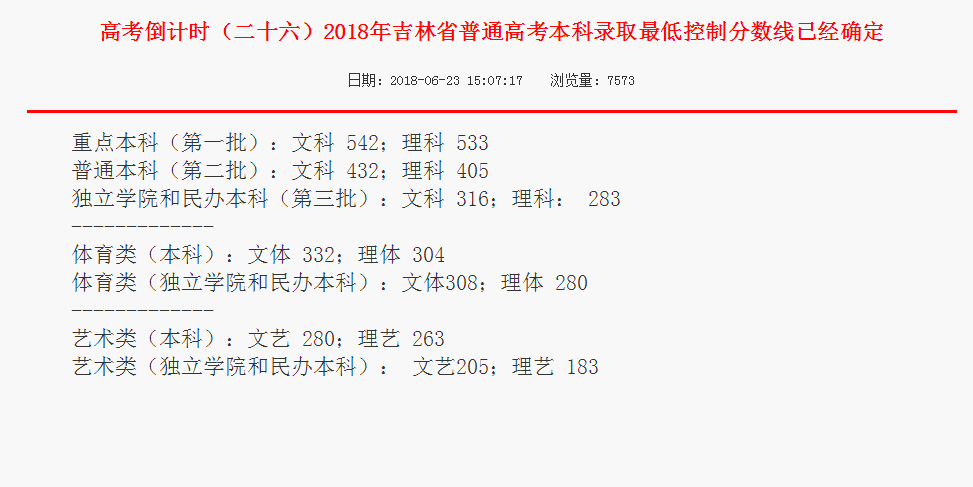吉林2018招生錄取一本線文科542分 理科533分