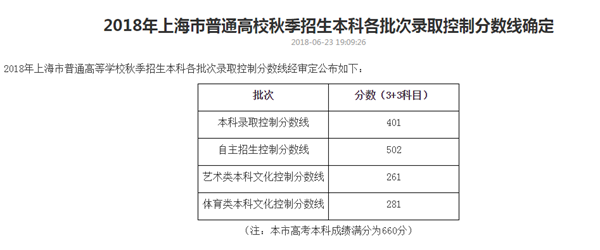 上海公布2018年招生錄取本科控制線401分