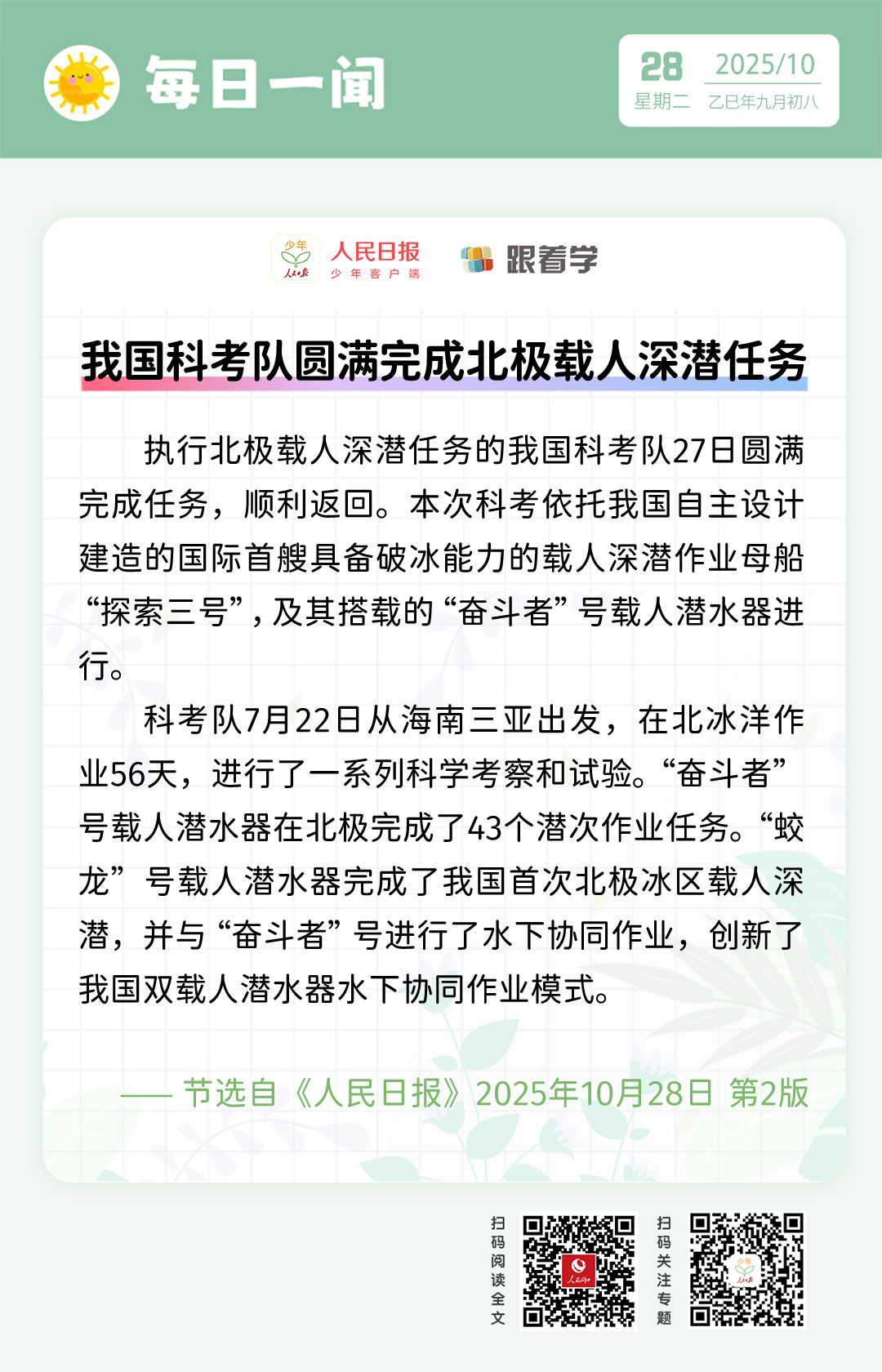 每日一聞丨我國科考隊圓滿完成北極載人深潛任務