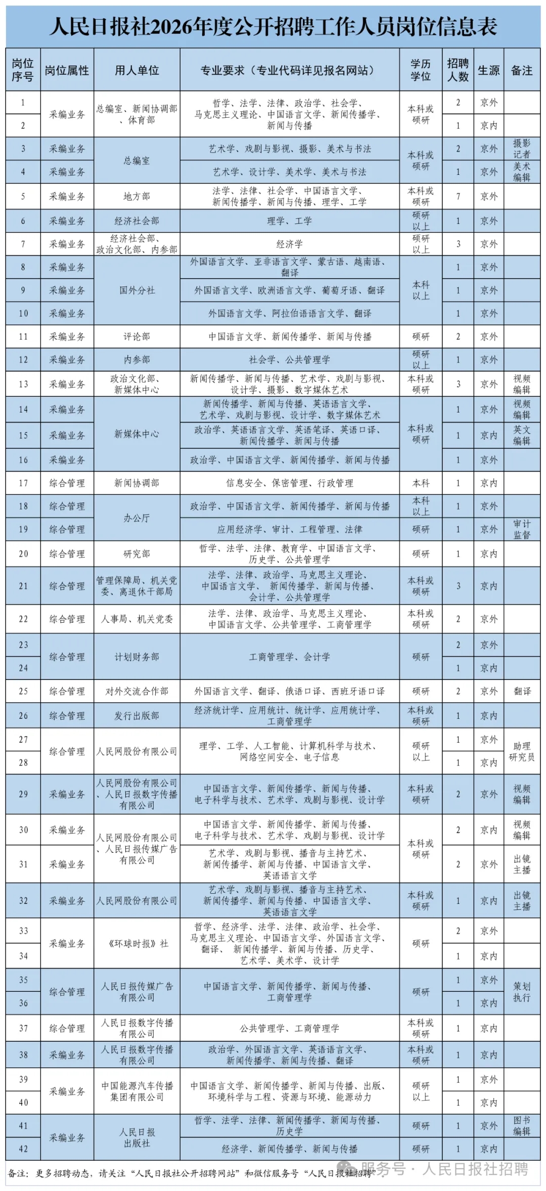 根據(jù)事業(yè)發(fā)展需要,人民日報社2026年度面向國內(nèi)高校應(yīng)屆畢業(yè)生和海外留學(xué)人員公開招聘工作人員64名?,F(xiàn)將有關(guān)事項公告如下。